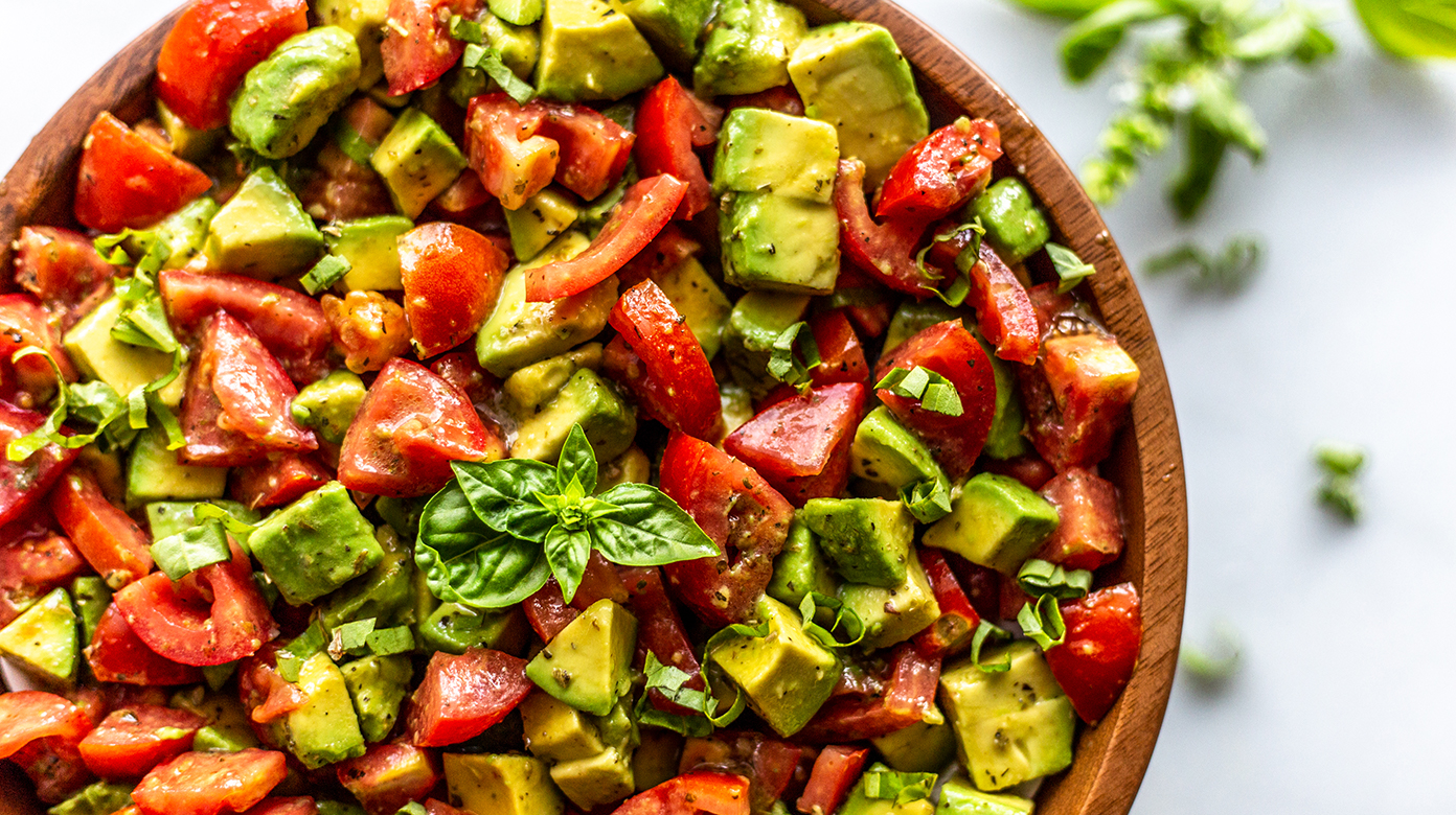 Serve the avocado and tomato salad immediately as a healthy and refreshing